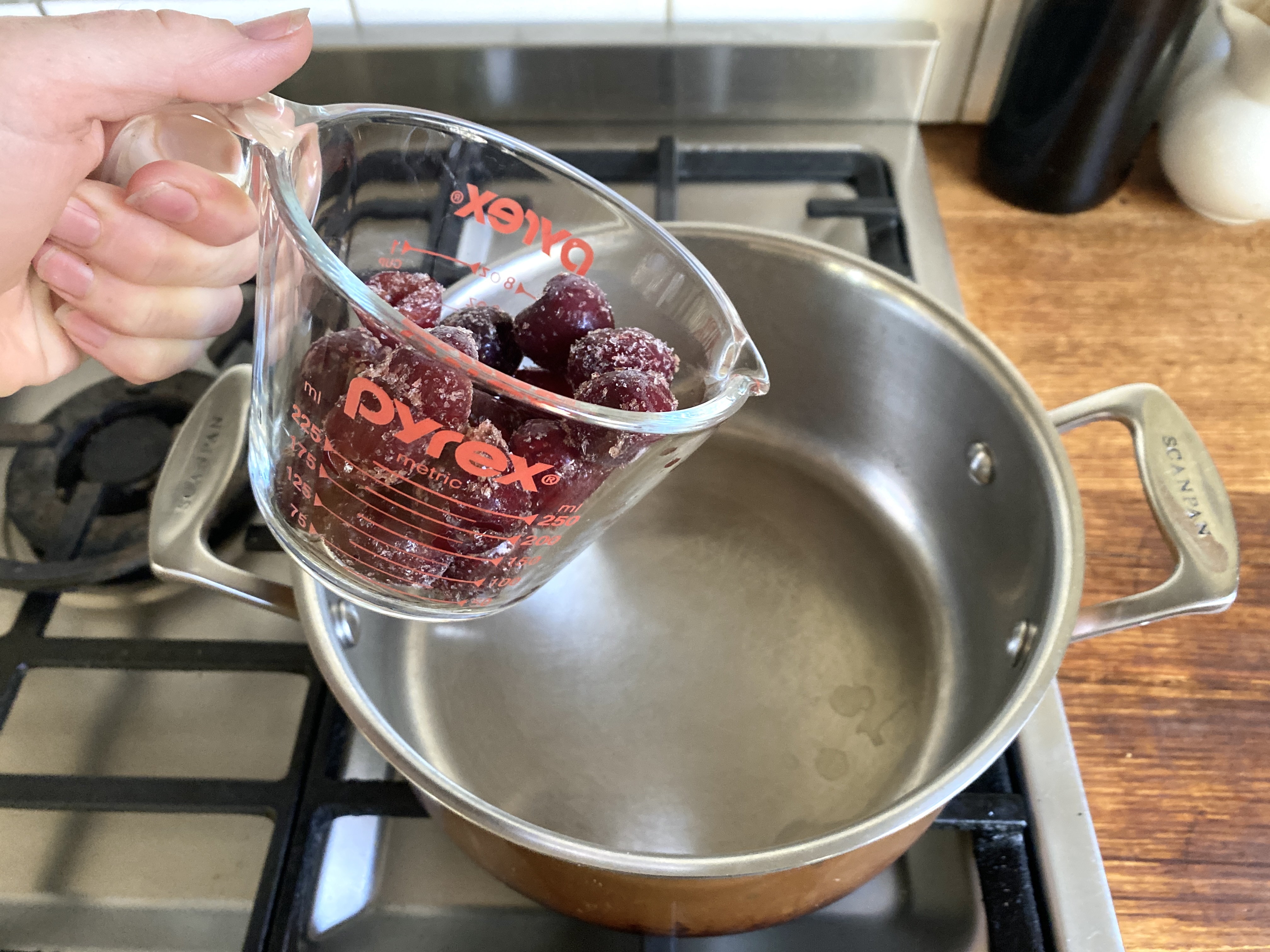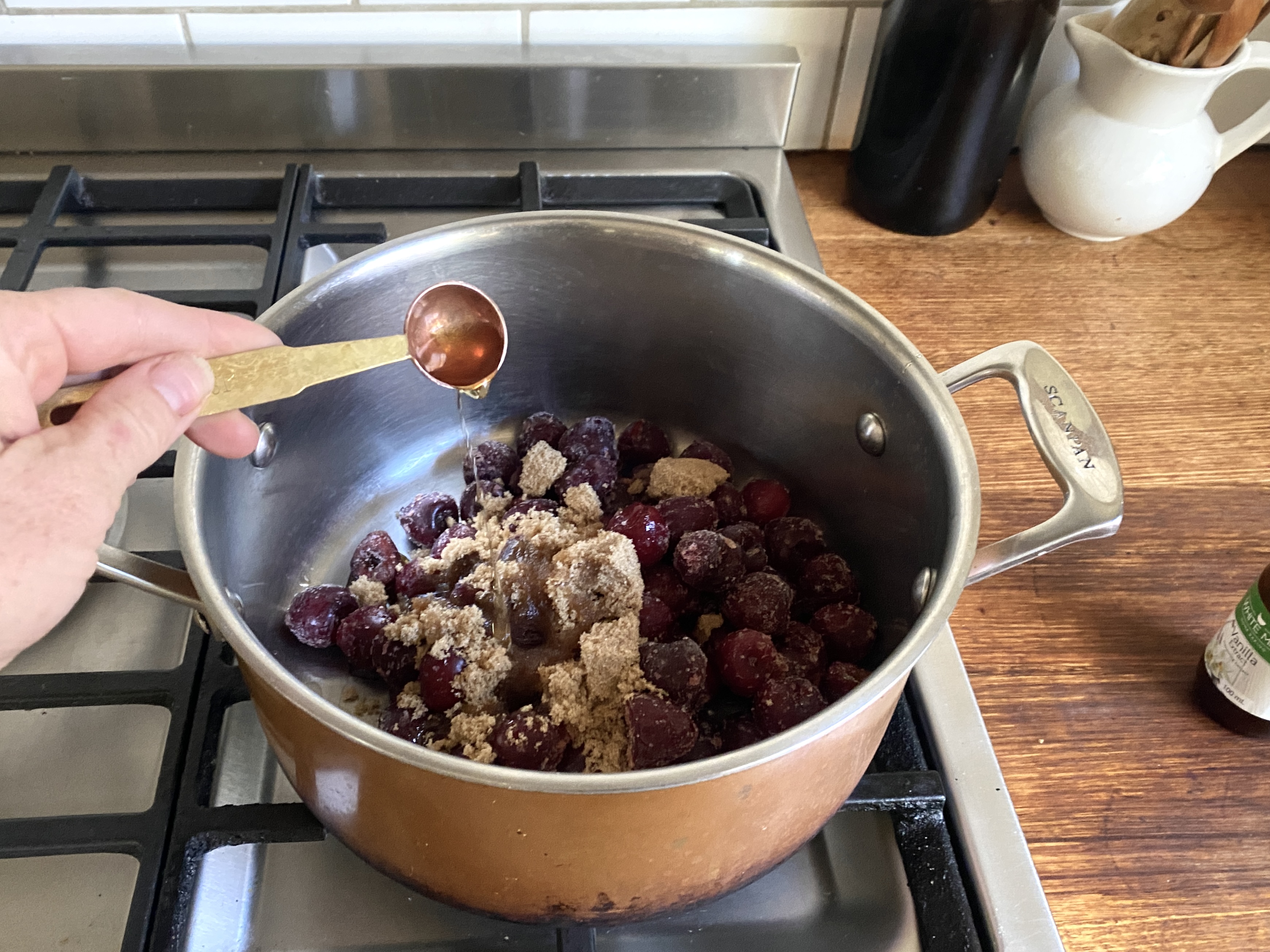Stir well and cook on a medium heat until cherries are softened all the way through and the juice forms a thick syrup. Set aside.