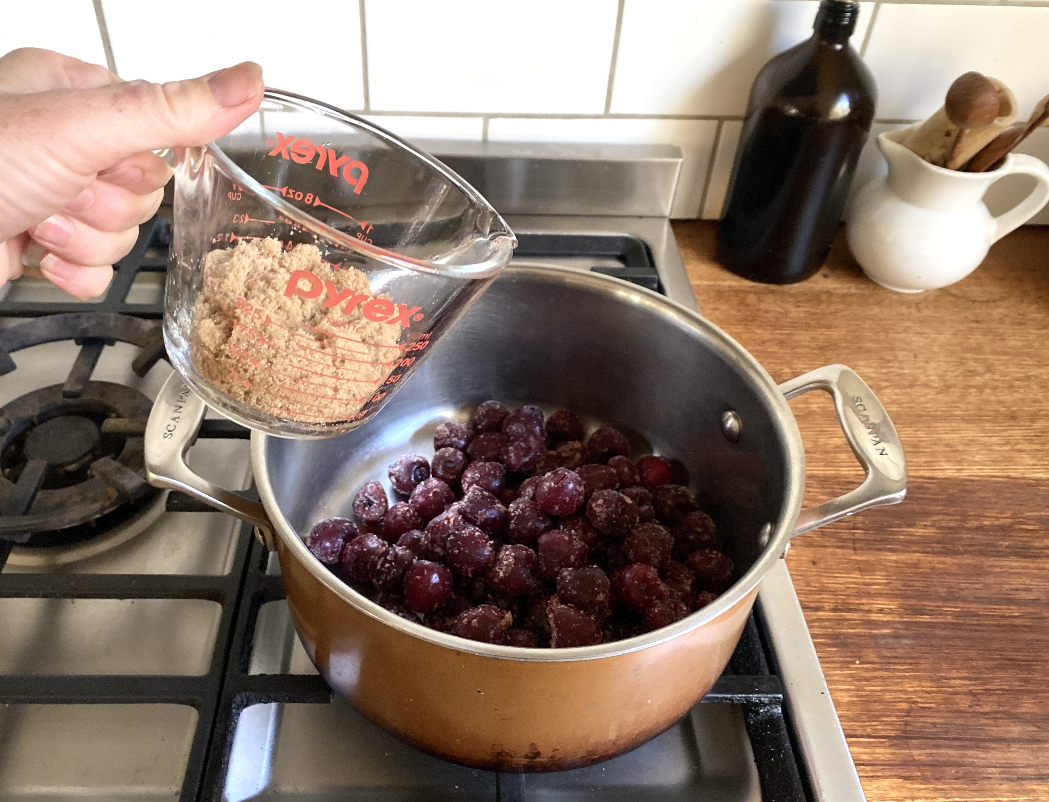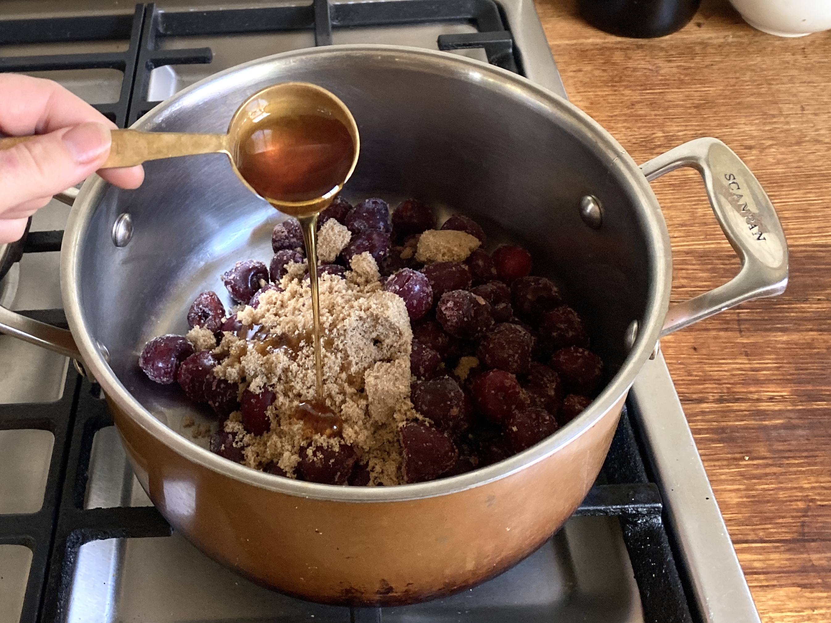 - Place four cups of frozen cherries, brown sugar, maple syrup, vanilla essence, lemon juice and cornflour into a large saucepan.