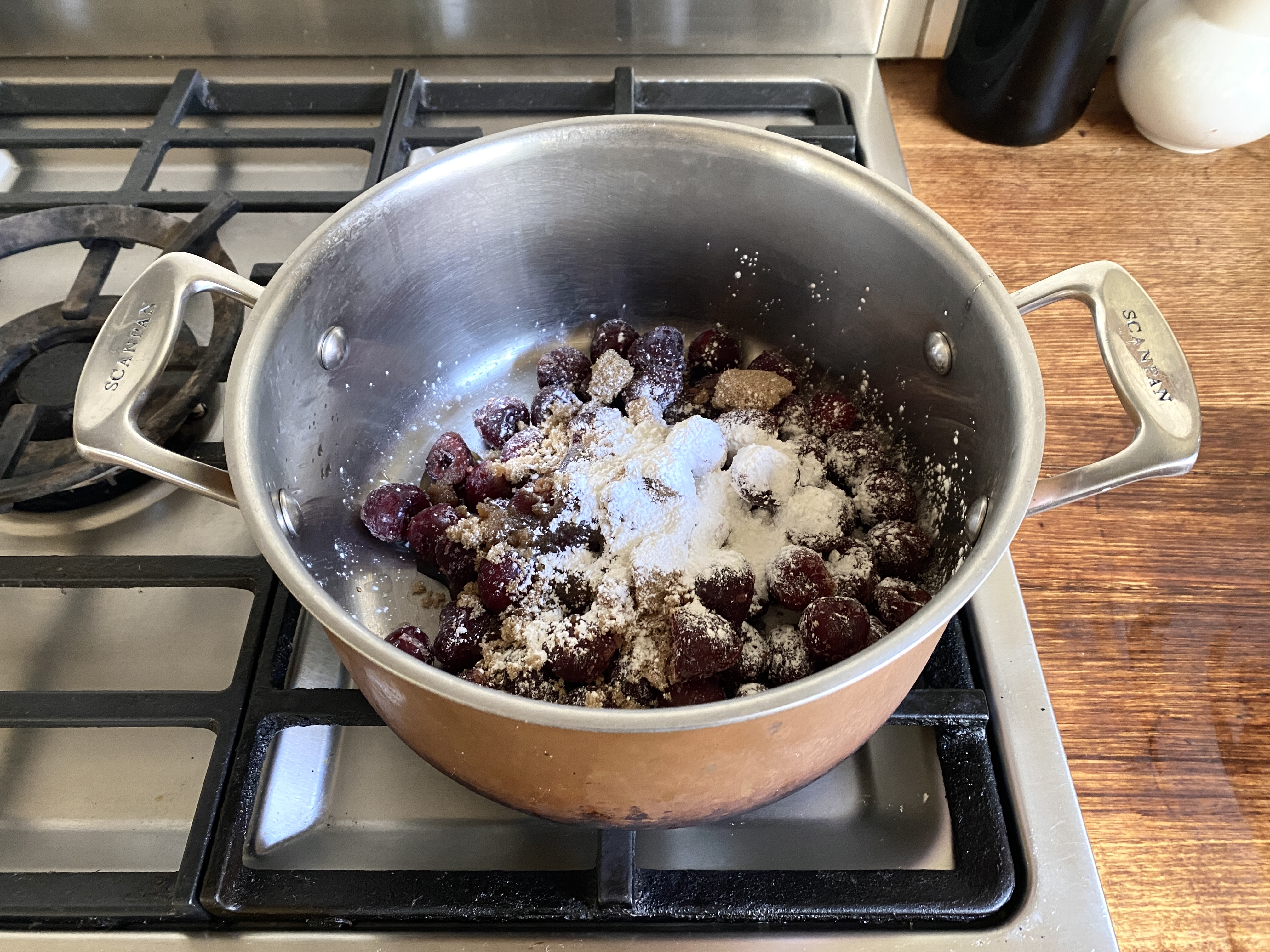 - Stir well and cook on a medium heat until cherries are soft and the juice forms a thick syrup. Set aside.