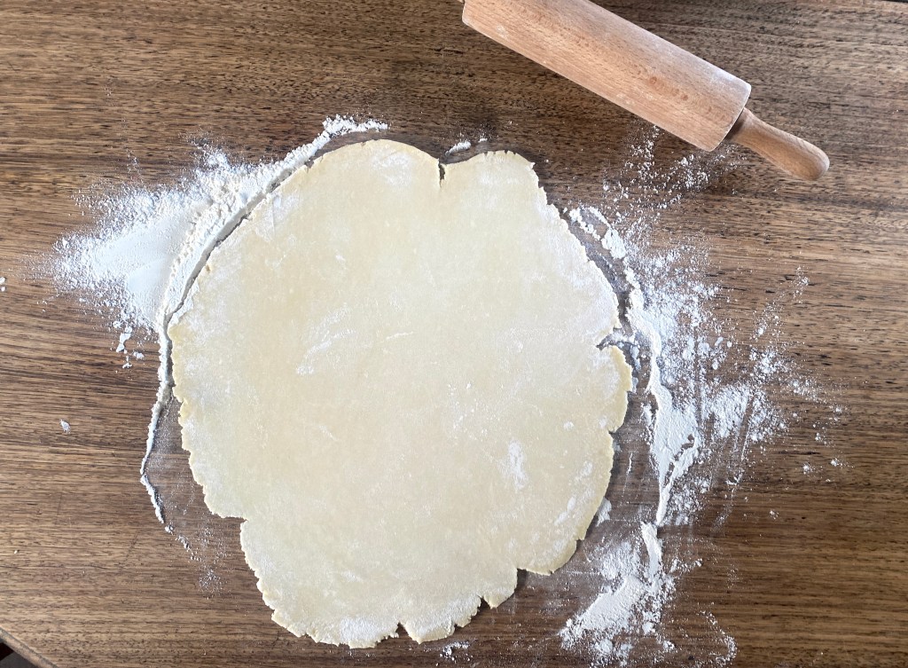 Take pastry dough from refrigerator and separate and shape dough into two round disks. Roll the first disk out on a well floured surface until quite thin, approximately 1/8 inch or 3 mm thick, flipping over throughout to coat with flour and prevent from sticking to the countertop. Rolled out, It should be roughly 14 inches or 35 cm in diameter.