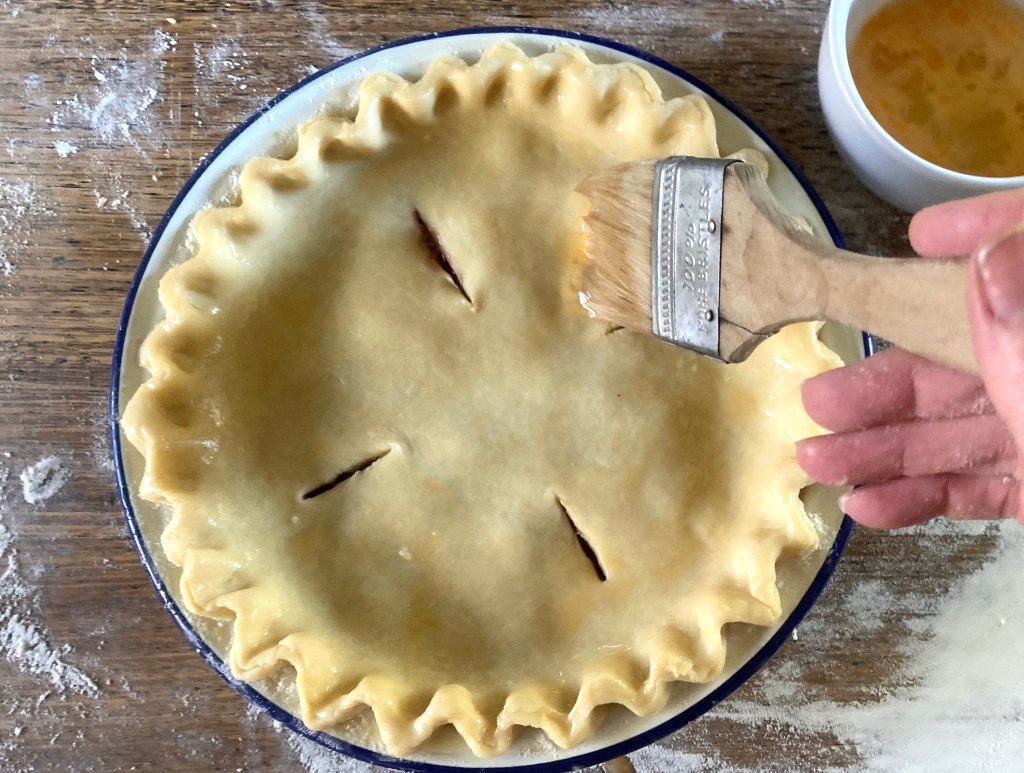 - With a serrated knife, add ventilation holes and then brush the top of the pie with a beaten egg.
